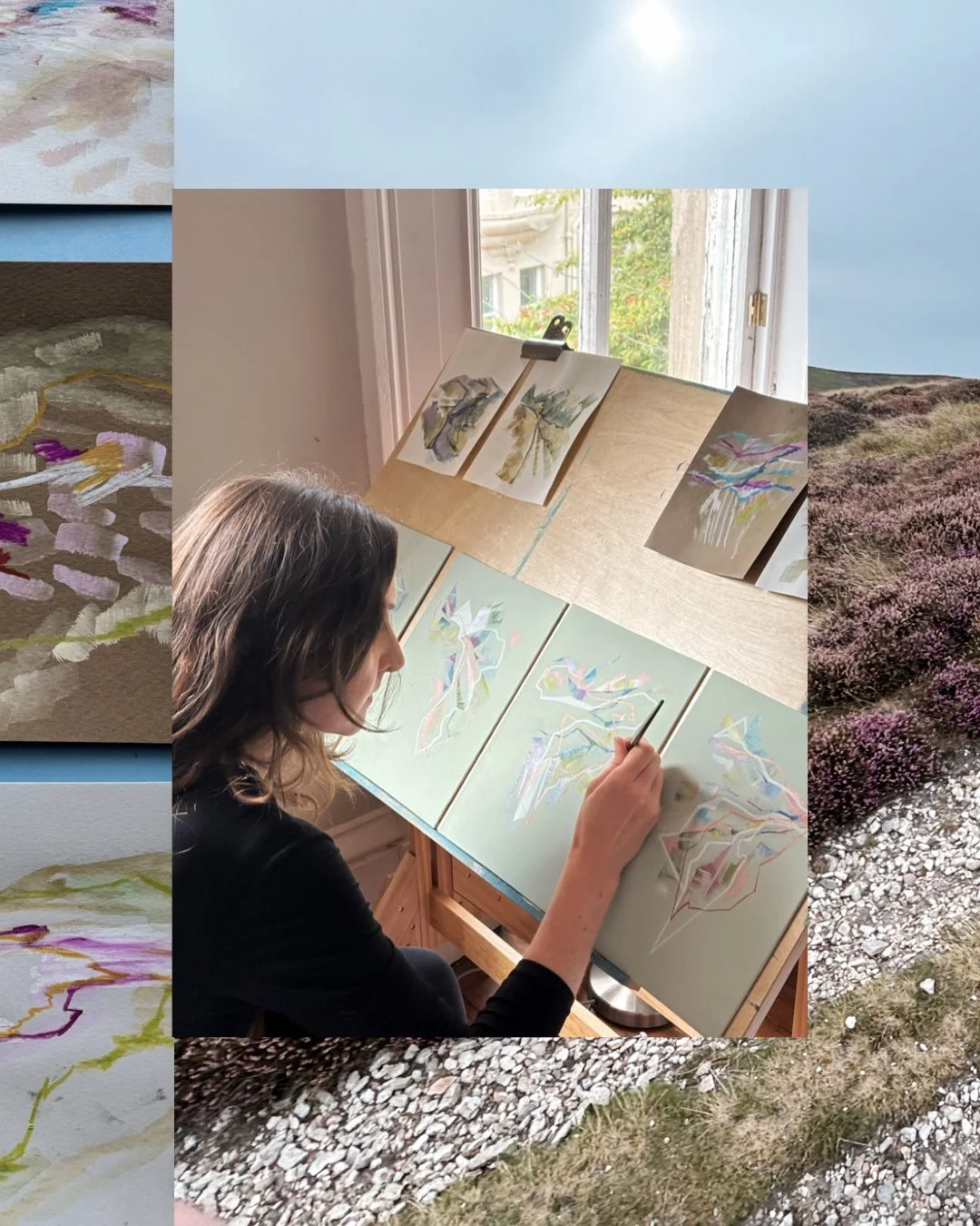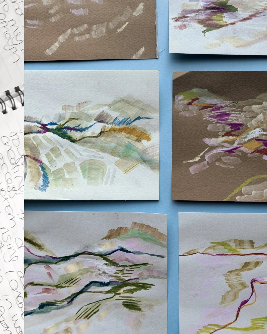 My personal practice is rooted in movement. Using running as both inspiration and process, I am currently working on an ongoing series of abstract landscapes painted from memory. Each work draws from sketches and notes made after my runs, translating the rhythm, terrain and atmosphere of the places I move through into colour and form.